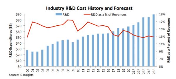 (研发成本和收益关系预测,数据来自IC Insight)