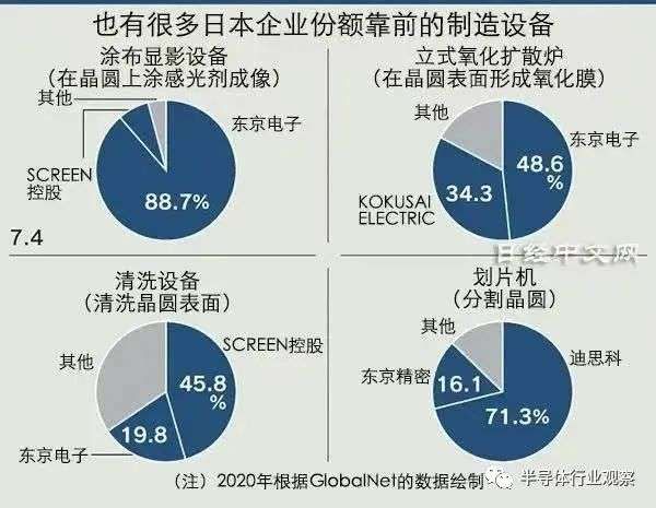 设备方面,GlobalNet指出,仅东京电子在涂布显影设备上的份额就占到近9成,是世界唯一的量产企业。在清除晶圆垃圾及污物的清洗设备上,日本企业的份额超过6成。后制程设备的划片机方面,DISCO拥有7成份额。