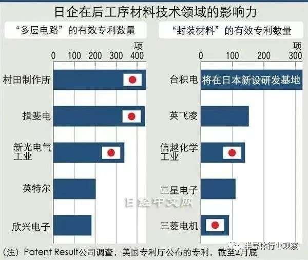 在后制程的代表性材料技术“多层电路”、“封装材料”的有效专利数量方面,专利调查公司Patent Result有统计显示:与推进后制程技术研发的台积电和英特尔一起排在前列的日本企业有信越化学、IBIDEN及新光电气工业等。