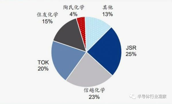 日本半导体行业虽然大不如前,但在半导体材料领域仍然占据主导地位。上文也有提到,尤其是在光刻胶领域,全球大部分市场被JSR、东京应化等日本企业占据。