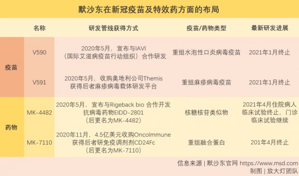2021年1月,由于临床数据不及预期,默沙东终止了候选新冠疫苗V590、V591的开发,转而主攻新冠特效药的研究。