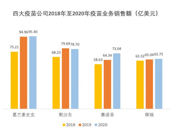 疫情之前,疫苗四巨头(Big Four vaccine makers)——辉瑞(Pfizer)、葛兰素史克(GSK)、默沙东(MSD)、赛诺菲(Sanofi)占据全球疫苗市场九成份额,疫苗年销售额达300多亿美元。但迄今为止,除了辉瑞,其它三家疫苗巨头表现都不如人意。