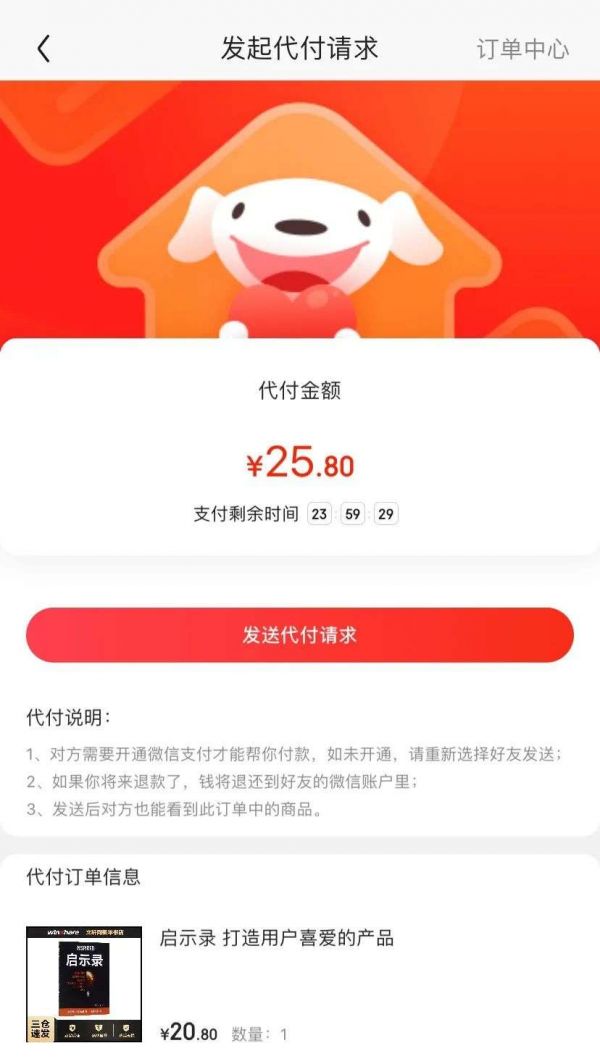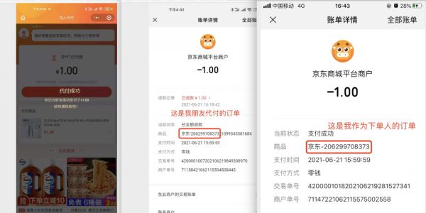 她在做产品的过程中为了对标同类产品的实现逻辑,专门测试了京东和淘宝的「代付」功能。在使用京东 App 的好友代付功能时发现,针对同一个订单竟然可以支付两次。