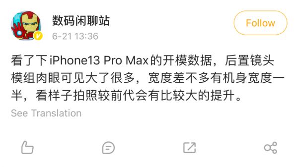近日,靠近供应链的数码博主透露,苹果新款iPhone超大杯(或为 iPhone 13 Pro Max)的后置镜头模组「肉眼可见」要比现有的iPhone 12 Pro Max大,宽度差不多有机身的一半。
