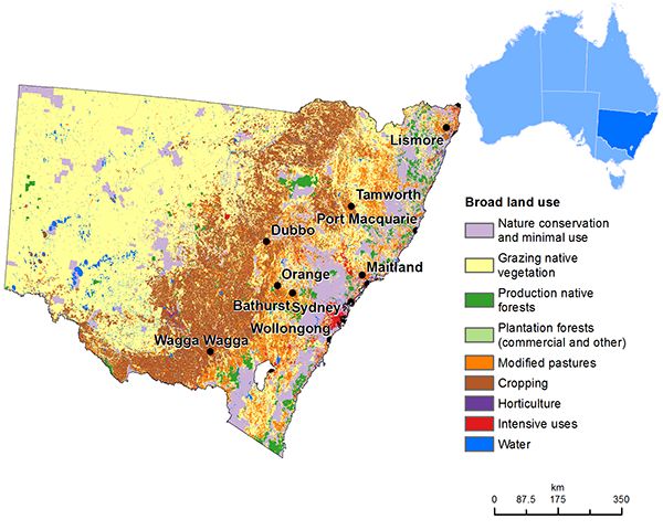 ● 新南威尔士州土地利用类型图,棕色部分为农田 / 澳大利亚农业、水和环境部