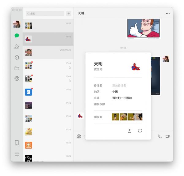 查看好友朋友圈这样的翻旧账功能也与手机体验保持一致,在聊天对话中点击对方的头像,就能弹出窗口中找到朋友圈的入口。配合鼠标滚轮和时间过滤,翻「黑历史」非常好用。