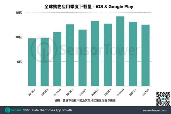 Sensor Tower 商店情报预估数据显示,2021年上半年,全球购物应用下载量达到24.7亿次(截至6月22日),略高于去年同期23.8亿次,相较2019年上半年增长32%。