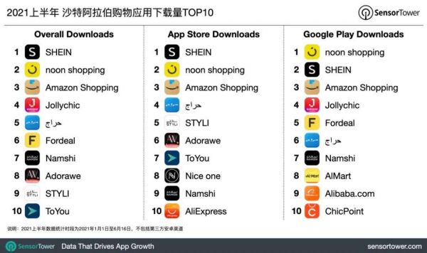 在以沙特阿拉伯为代表的中东市场,中国跨境电商同样受当地用户热捧。SHEIN超越沙特阿拉伯本土电商noon shopping,位列当地购物应用下载榜榜首。另一个中国跨境电商平台 Jollychic 同样取得佳绩,排名从2020年第6名,上升至本期第4名。
