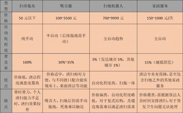 老局长将清扫方式分为大致分为四类,即扫帚拖布、吸尘器、扫地机器人与家政服务。