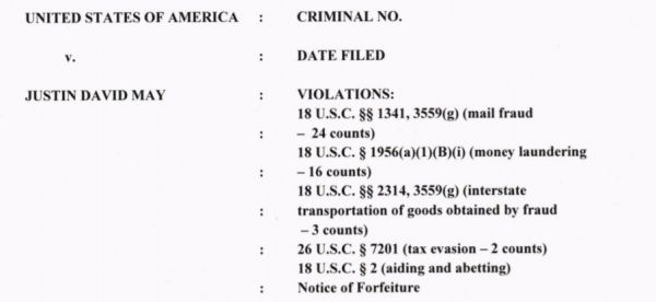 直到被捕时,贾斯汀·大卫·梅一共犯下了42宗邮件欺诈、10宗网络洗钱、3宗州际运输欺诈和2宗逃税。