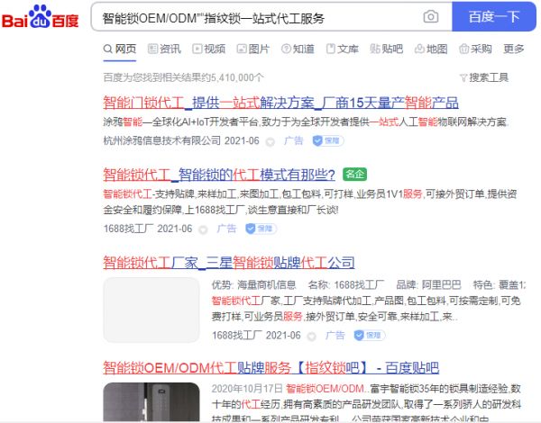 目前智能锁行业,代工生产已不是行业的秘密,网络上更是充斥着各类智能锁代工的广告—智能锁OEM/ODM”“指纹锁一站式代工服务”“智能锁贴牌、智能家居方案”…