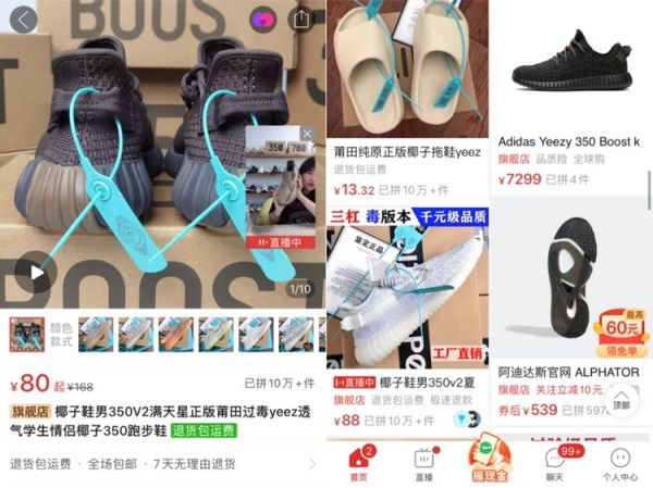 尽管拼多多做出了一些保真努力,但商品页上依旧真假齐飞。售价不到百元的“椰子鞋”玩起文字游戏,标榜自己是“正品莆田”,动辄就是10万+件的拼单量,而那些由Solestage等经销商出售的正版椰子,往往只有3、4双鞋的销量。