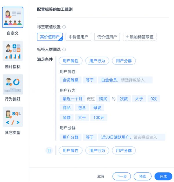 高价值用户的计算需要结合用户的属性、用户的行为和用户真正的业务数据(订单、付费、充值等)来统一配置。只有业务数据会不知如何推动,只有行为数据也不能赋能转化。