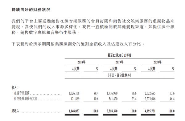 从招股书来看,网易云音乐的收入构成分为“在线音乐服务”与“社交娱乐服务及其他”两部分,这与腾讯音乐娱乐集团(TME)的收入构成描述一致。