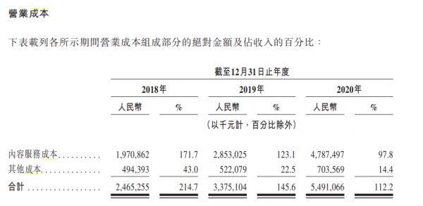 招股书显示,2018年、2019年及2020年,网易云音乐分别产生收入成本人民币25亿元、人民币34亿元、人民币55亿元,其中主要的成本都是内容成本,主要包括向音乐厂牌、独立音乐人及其他版权合作伙伴支付的内容授权费及向直播表演者及其直播公会支付的收入分成费。