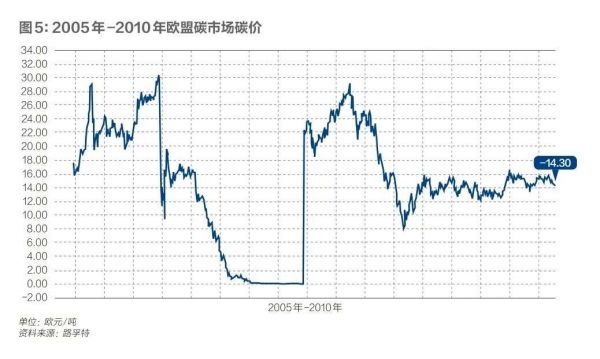 欧盟碳交易起始价较高,2005年初从15欧元/吨价位迅速上涨到28欧元/吨。但在2006年4月底,由于核查排放数据泄露,并显示发放给成员国的碳配额总数远高于实际排放,碳配额严重过剩。导致每吨碳价从30欧元暴跌至10欧元。此后,由于配额不能存储到下一阶段导致碳价继续暴跌,到2007年底接近零。