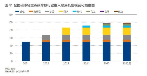 在碳市场涵盖的范围方面,未来以怎样的节奏纳入更多行业,尚未明确。首个控排行业发电行业的碳排放总量约为40亿吨,若电解铝、水泥、钢铁、化工、造纸、石化、航空等七大高耗能行业全部纳入全国碳市场,碳排放总量预计在80亿/年吨至100亿吨/年之间。