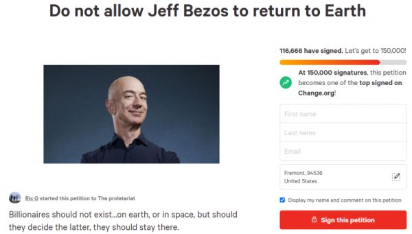 消息公布后,网上出现了两则以“别让贝索斯重返地球”为主题的请愿,要求贝索斯去了太空就别返回地球。截至6月24日下午,两个请愿人数总和超过了13万人。一位发起者Jose Ortiz在请愿里表示,贝索斯是一个“要征服世界的大恶魔、超级反派”,只是伪装成了电商公司创始人。这次是让他离开地球的唯一办法。