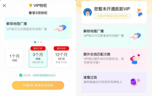 在最新的版本中,距距强化了地图社交的方式,并开始打造VIP会员模式。用户可通过开通VIP会员,解锁地图广播,在地图上可以发布内容,并附上一些标签,比如一起打游戏、逛街等。除此之外,VIP还能额外获得在线匹配次数,并了解到哪些用户看过VIP用户的界面。