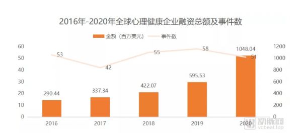 从融资情况来看,这一市场这些年来也是增长迅速。2020年心理健康领域发生51起融资事件,累计融资10.48亿美元,同比增加76%;而单笔融资平均融资金额已达2054万美元,约2019年的2倍。
