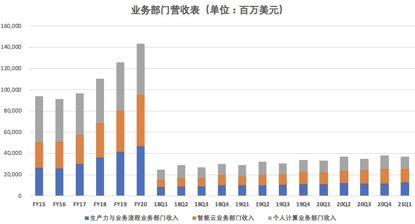 2021财年Q1,微软生产力与业务流程业务部门收入123.19亿美元,较上年同期的110.77亿美元,增长11%,较上一季度的117.52亿美元,增长5%。该部门主要包括Dynamics、 LinkedIn和Office产品。