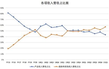 自2020财年Q4开始,产品贡献的营收逐步降低,服务和其他收入成为重要营收。