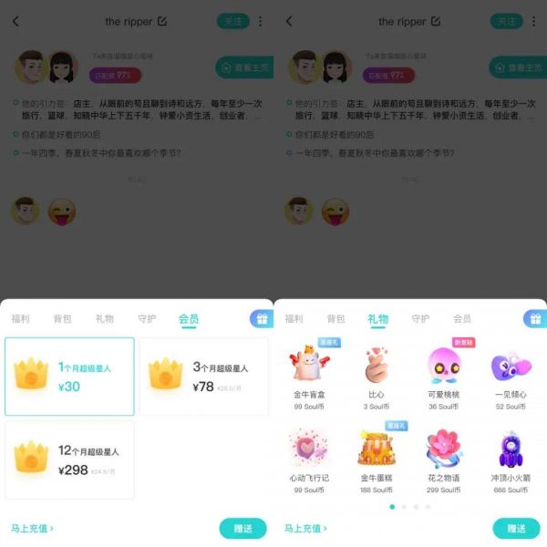 Soul APP的聊天页面可以赠送虚拟礼物和购买会员