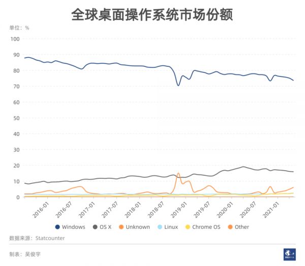 Windows操作系统自身市场份额正在下降。对比五年前的87%,其份额已经下降了12%。