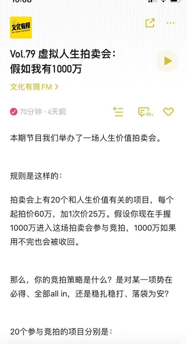 “文化有限”播客在本周登上小宇宙排行榜的一期播客里正好也做了一个小小的“拍卖游戏”,只不过这里被拍卖的是一系列人生选项:有一个幸福美满的家庭、赚大钱、长寿而无大疾病、有一些知心朋友……默认的是如果你有一千万,那你会选择如何用手上的这一千万来竞拍这20个人生选择。听起来是不是就很interesting呢?