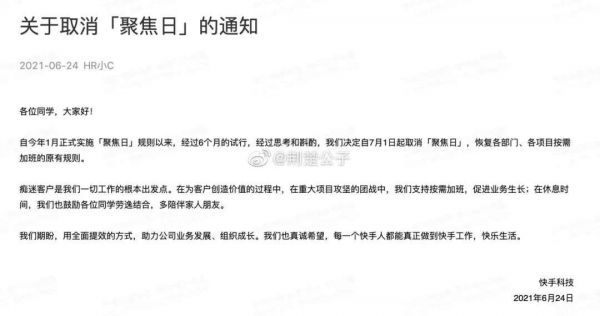 又一家公司加入“反内卷”,快手宣布7月起取消大小周