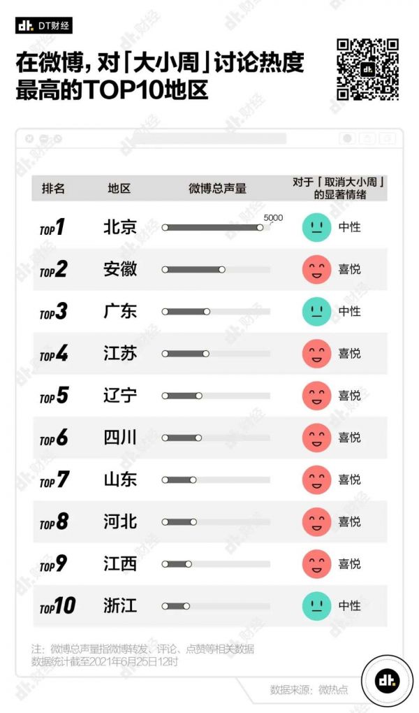 微博上,对「大小周」讨论热度最高的TOP10地区中,当大部分地区都认为取消大小周是一件好事、表现出喜悦的时候, 北京、广东、浙江这三个互联网大厂主要分布的地区,显著情绪都是中性的。