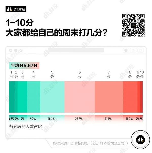 DT君曾在上个月发布一份「国产青年周末怎么过大调查」,在回收到的 3037 份有效问卷中,我们发现,以 10 分为满分,年轻人对自己周末的评价平均只有 5.67 分,有超过四成的人打了不及格。