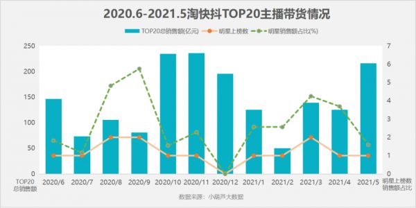 小葫芦大数据显示,从去年6月到现在,抖音快手淘宝主播带货TOP20榜单中,上榜的明星最多只有两位,而明星带货销售额占比在经历过去年下半年的一波小高峰后,便呈下滑态势。特别是在双11和618期间,top20主播中明星带货的销售额只占不到3%的比例。