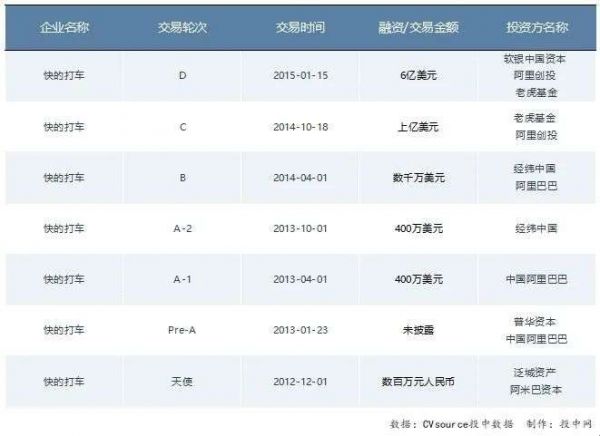 根据CVSource投中数据,快的历史上一共进行了7轮融资,总额超过7亿美元,投资方包括原阿里战投负责人赵鸿创立的阿米巴资本、普华资本、阿里巴巴、经纬中国,以及老虎环球基金、软银中国等。