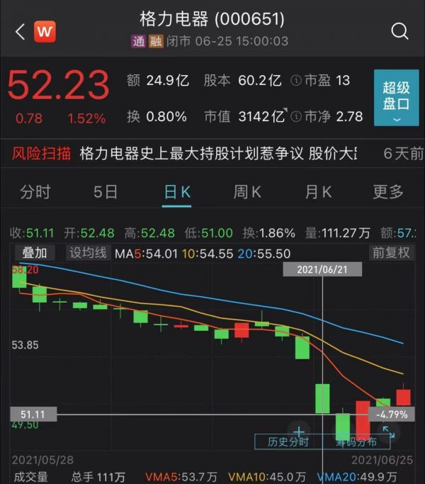 不过该持股计划推出后引发了不少争议,包括行权价低至5折、业绩增长考核指标仅为10%、董明珠独占8亿元浮盈、员工退休后才能行使权利等。资本市场对此也很快做出反应,6月21日格力电器下跌4.79%,当天市值蒸发154.6亿元。6月22日,格力电器股价跌破50元,跌至近期低位,随后小幅回升。