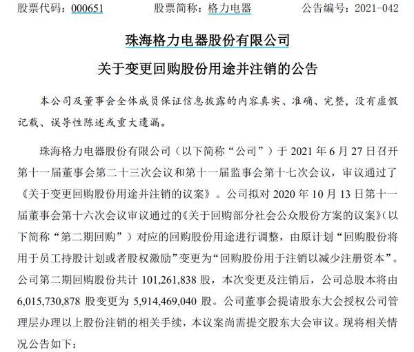 6月27日晚间,格力电器(000651,SZ)发布公告称,拟对2020年10月13日第十一届董事会第十六次会议审议通过的《关于回购部分社会公众股份方案的议案》(简称“第二期回购”),对第二期回购股份用途进行了调整,由原计划“回购股份将用于员工持股计划或者股权激励”变更为“回购股份用于注销以减少注册资本”。