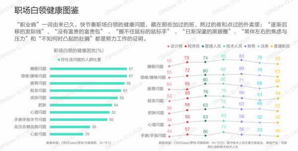 过劳肥是大厂白领的职业病,除此之外,根据第一财经商业数据中心发布的《2021职场白领健康图鉴》,困扰员工的还有睡眠、脱发、颈椎腰椎等问题。
