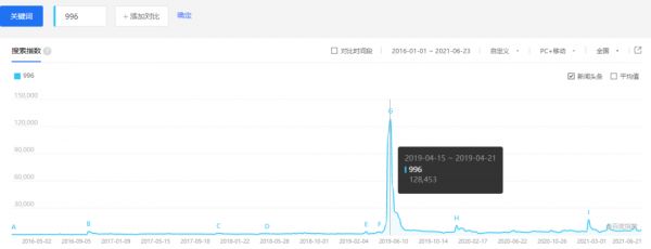 从百度指数来看,“996”相关的百度指数,在2019年4月前后呈现了井喷式增长。虽然一个月过后,相关热度迅速回落,但这并不影响“996”进一步地广泛传播。
