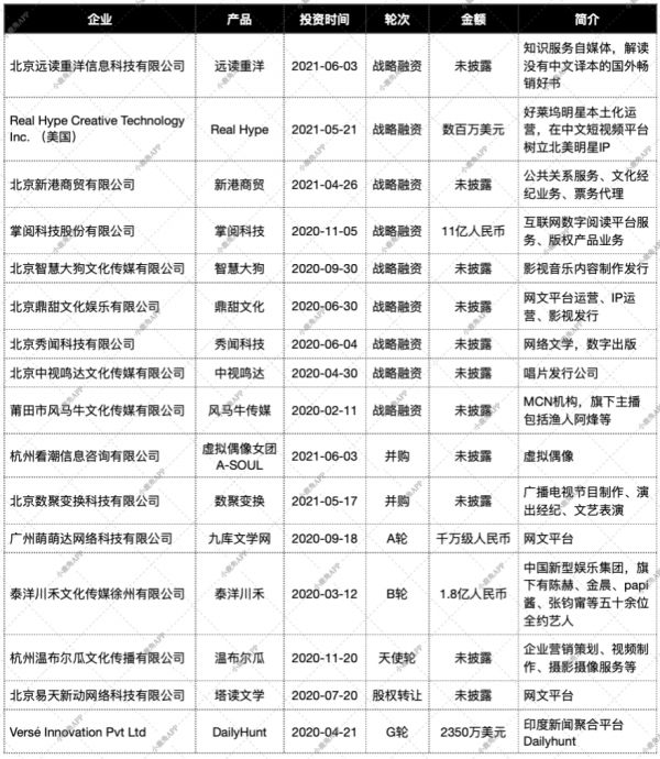 在2020年以来的投资中,字节跳动在网络文学、影视音乐等IP方面,经纪公司、MCN机构、自媒体等内容产出方,以及发行方都进行了投资布局。