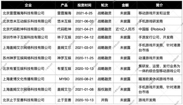 在2020年至今的游戏方面投资,字节跳动也同样加强关注具有研发实力的手机游戏公司。其中有深入研究虚幻4引擎的悠米互娱,利用高画质形成了独特优势;拥有自研物理引擎的UGC游戏创作平台《重启世界》的代码乾坤;开发出港澳台地区爆款游戏《仙境传说RO:新世代的诞生》的盖姆艾尔;专注二次元并在日本市场制造多款爆款的有爱互娱等。