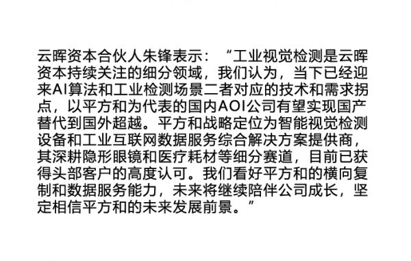 平方和是36氪持续报道的公司,于2018年6月开始正式运营,业务范围涵盖机器视觉及工业数据平台软件的定制、行业智能视觉设备的定制与开发、光学成像系统设计和视觉生产数据整合等,为工业制造企业提供全栈式视觉服务及企业级解决方案。