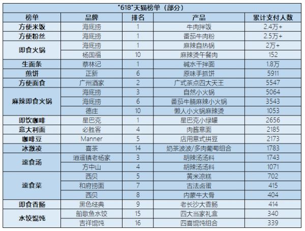 在本届“618”角逐中,餐饮品牌上线的品类得到了极大的丰富,从过去的火锅底料、蘸料、面点、即饮咖啡等少数传统品类扩充到了自热食品、速食菜、速食汤等多品类。