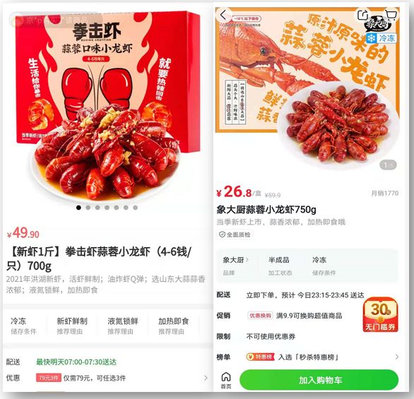 △左图为叮咚买菜自营品牌拳击虾,右图为美团买菜自营品牌象大厨