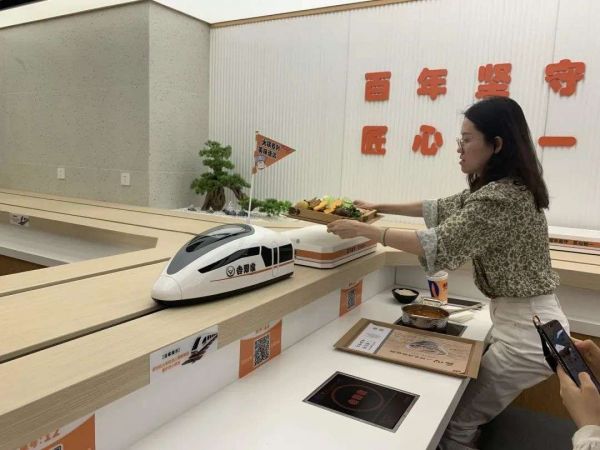 顾客直接手机扫码点餐,后厨将配好的餐放在托盘,再放到小火车上面。按启动键后,小火车从厨房档口出发,开始了送餐旅程,送到指定顾客面前,顾客直接把餐端下来即可。