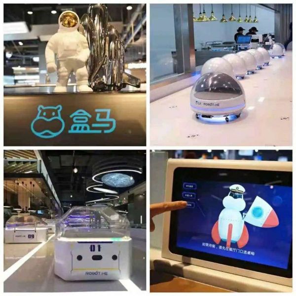 年中,盒马鲜生首个机器人自动化餐厅落户上海,主推机器人炒菜、智能送餐等。将4000平米的门店一分为二,一半是货架,一半是餐厅。货架和餐厅的连接处,是一个类似物流仓库的透明玻璃房。里面一个自动机械臂,操控着从货架来的新鲜食材往厨房窗口输送;