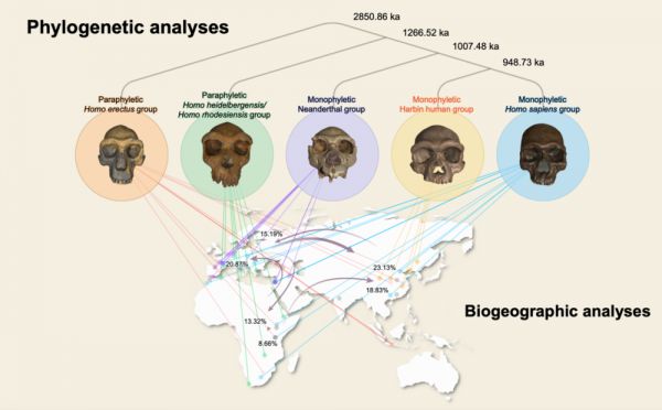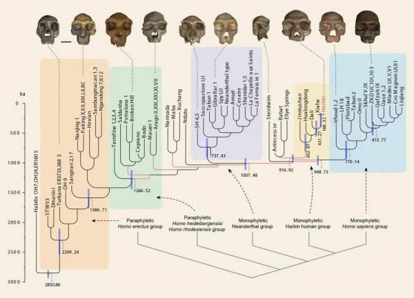 为分析“龙人”与智人、尼安德特人、海德堡人、直立人等人种或人群的系统演化关系,科学家建立了超过 600 项特征、近 100 件对比标本的数据库,并以此为基础开展了简约性分析和贝叶斯分析。他们发现,智人、尼安德特人和龙人所属的支系都是单系类群,龙人支系与智人是姊妹群,有着最近共同祖先。研究同时表明,智人、尼安德特人和龙人有着更加古老的分异时间,可能早在 100 万年前就走向了不同的演化道路,我们与尼安德特人分离的时间可能比早先认为的早 40 万年。