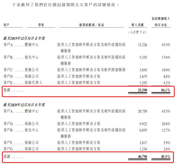 其中,公司最大客户是一家体检中心,在2019至2020年的收入为人民币1322.6万元及人民币2075万元,分别占公司同期收入的43.5%及 43.5%。