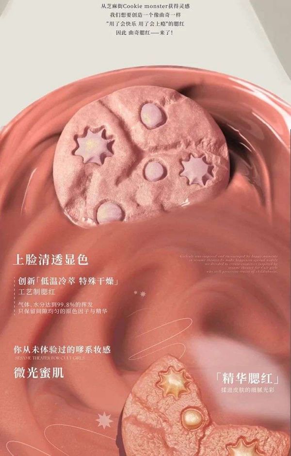 除了添加食品成分,很多彩妆品牌在产品外观设计和外包装上也纷纷向食品“看齐”。例如,Girlcult与芝麻街联名推出的曲奇造型腮红;小奥汀的芝心奶酪样式腮红,在不同颜色的区分上使用了豆沙、蜜杏、香芋等食品名称。