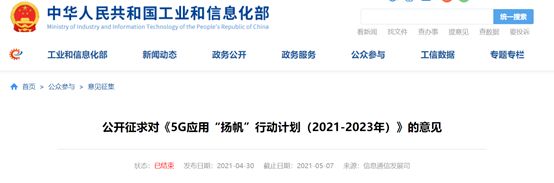 2021年4月30日,工信部发布《5G应用“扬帆”行动计划(2021-2023年)》征求意见稿,里面提出“大力推动5G全面协同发展,深入推进5G赋能千行百业,促进形成‘需求牵引供给,供给创造需求’的高水平发展模式”。