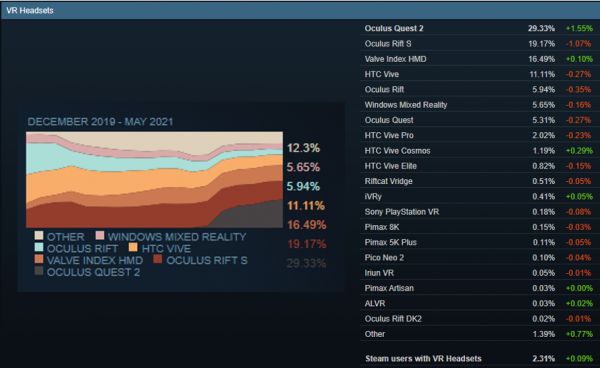 现阶段,消费级VR设备主要还是应用在游戏领域。根据今年5月Steam官方数据,Oculus Quest 2是平台占比最高的VR设备(29.33%),其次是Oculus Rift S(19.17%),此外Oculus Rift也占有5.94%的比例。